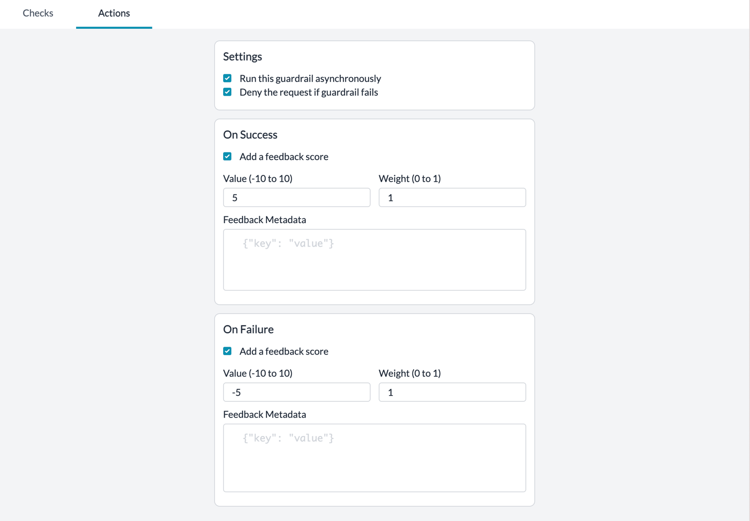 | On Success | Send Feedback | If all of the Guardrail checks PASS, append your custom defined feedback to the request | We recommend setting up this actionThis will help you build an “Evals dataset” of Guardrail results on your requests over time |